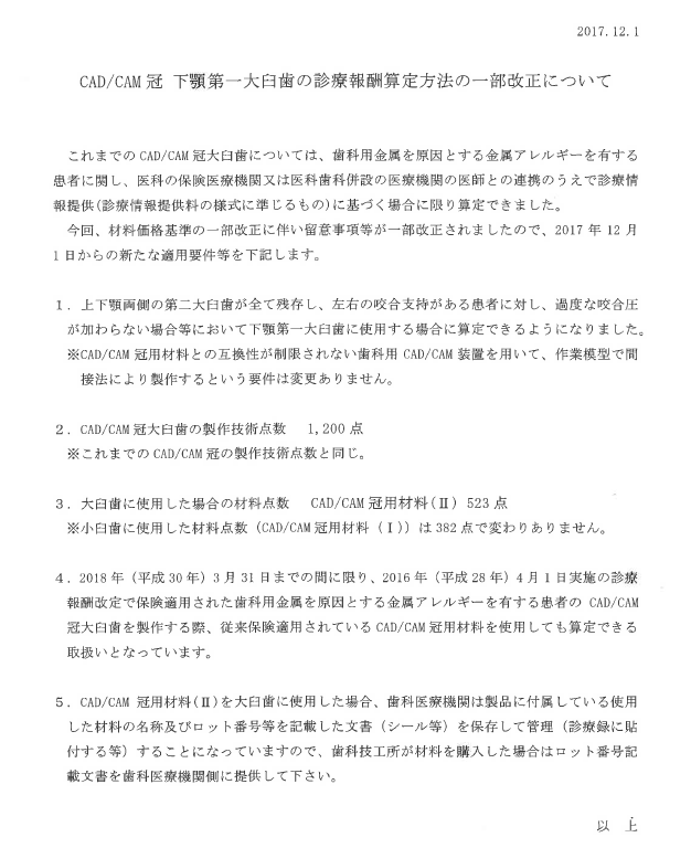 Home > 新着情報 > CAD/CAM冠 下顎第一大臼歯の診療報酬算定方法の一部改正について